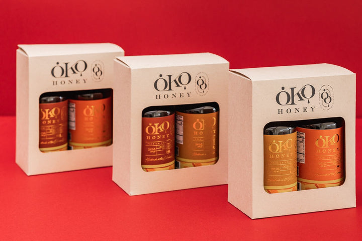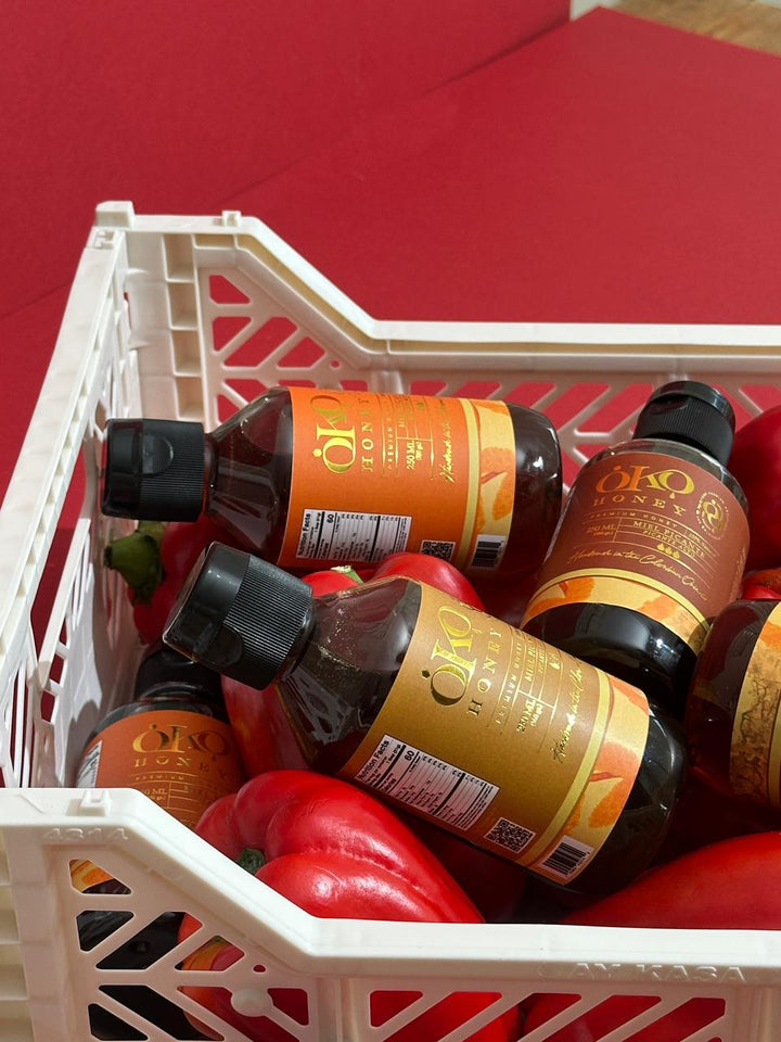 La base de esta miel, es nuestra miel de OKO Honey, un tesoro de la naturaleza. De color oscuro y sabores silvestres, refleja la pureza de su origen. No utilizamos pesticidas ni señales electromagnéticas en nuestra finca, y nuestras abejas viven en un entorno libre de estrés, alimentándose y reproduciéndose de manera natural.