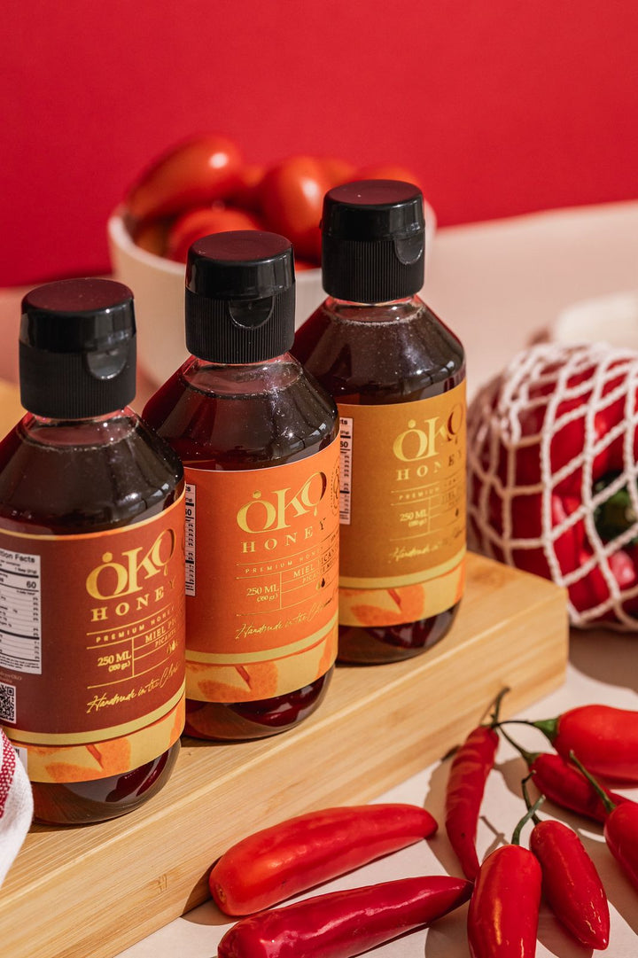 Miel 100% pura infusionada con chiles naturales, perfecta para disfrutar con alitas, pizza, pollo, sanduches, quesos, tostadas y mucho más!