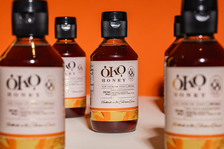 Nuestra miel OKO Honey, un tesoro de la naturaleza. De color oscuro y sabores silvestres, refleja la pureza de su origen. No utilizamos pesticidas ni señales electromagnéticas en nuestra finca, y nuestras abejas viven en un entorno libre de estrés, alimentándose y reproduciéndose de manera natural.
